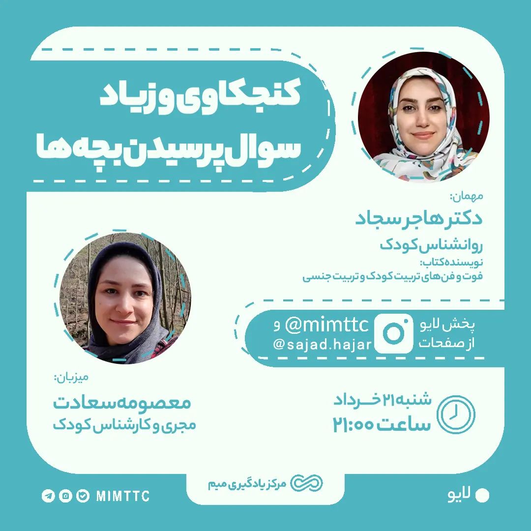 . تا حالا شده از دست سؤالهای بی حد و حساب بچهها کلافه و عصبی بشید؟🤯 . یا مثلاً با خودتون فکر کنید که بچه این سؤالهای عجیب رو با این حجم زیاد از کجای ذهنش میاره؟ 😲😒 . حالا ماجرا اونجایی جالبتر میشه که با جواب دادن به یک سؤال سیل سؤالهای بعدی جاری میشه. 😊 . ما توی لایوی که قراره امشب (شنبه، ۲۱ خرداد ساعت ۲۱) با خانم دکتر هاجر سجاد روانشناس کودک داشته باشیم، میخوایم در مورد کنجکاوی و زیاد سؤال پرسیدن بچهها صحبت کنیم. 😌 . #لایو #کنجکاوی #تربیت #تربیت_فرزند #کنجکاوی_بچه_ها #والد #والدگری #والدین #تربیتی #میم #مرکز_یادگیری_میم