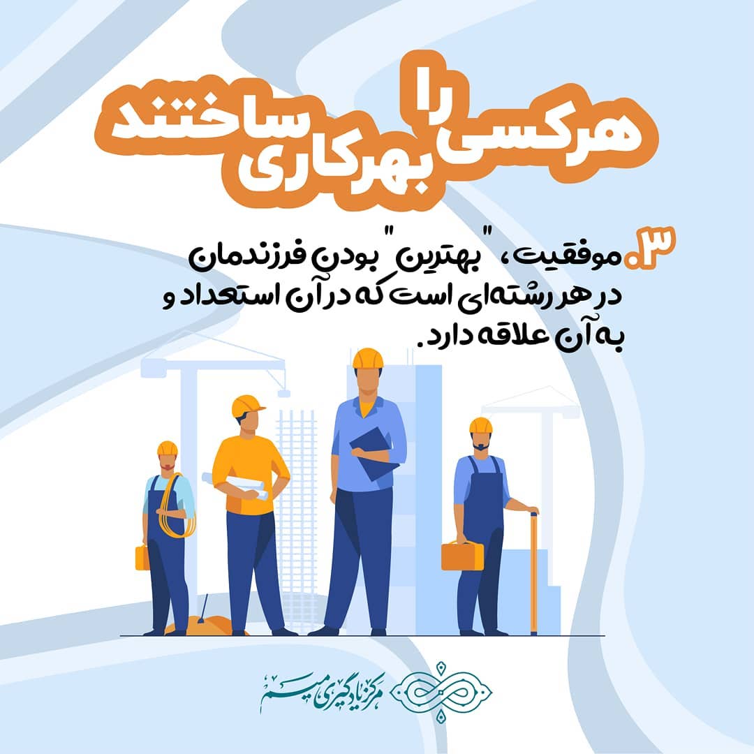 . 🔸هر کســی را بهر کـــاری ساختند ۳. موفقیت، "بهترین" بودن فرزندمان در هر رشتهای است که در آن استعداد و به آن علاقه دارد. #استعداد #استعدادیابی #نشاط #والدین #انتخاب_رشته #موفقیت