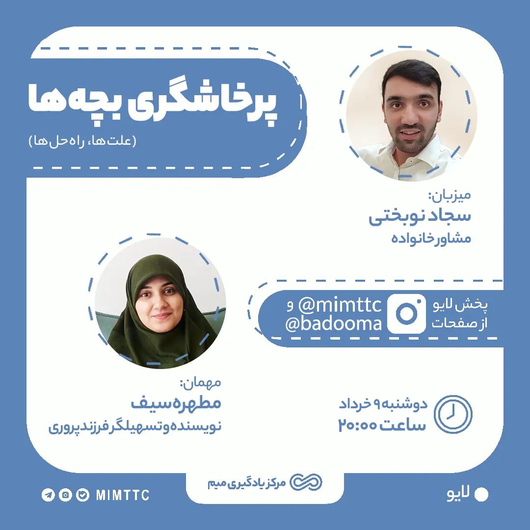. یکی از مشکلات رفتاری بچهها، پرخاشگریه. 😡🤬 . نوع مواجهه والدین با پرخاشگری در مدیریت این مسئله بسیار نقش مهمی داره. 👨👩👧👦 . ما قراره توی لایوی که با خانم مطهره سیف، تسهیلگر و نویسندهٔ فرزندپروری داریم در مورد پرخاشگری بچهها و علتها و راهحلهاش صحبت کنیم. میزبان این لایو آقای سجاد نوبختی، مشاور خانواده هستن. 🙂 . شما چه سوالها و چالشهایی دربارهٔ این موضوع دارید؟ 🧐برامون بنویسید تا از کارشناس لایومون بپرسیم.🤗