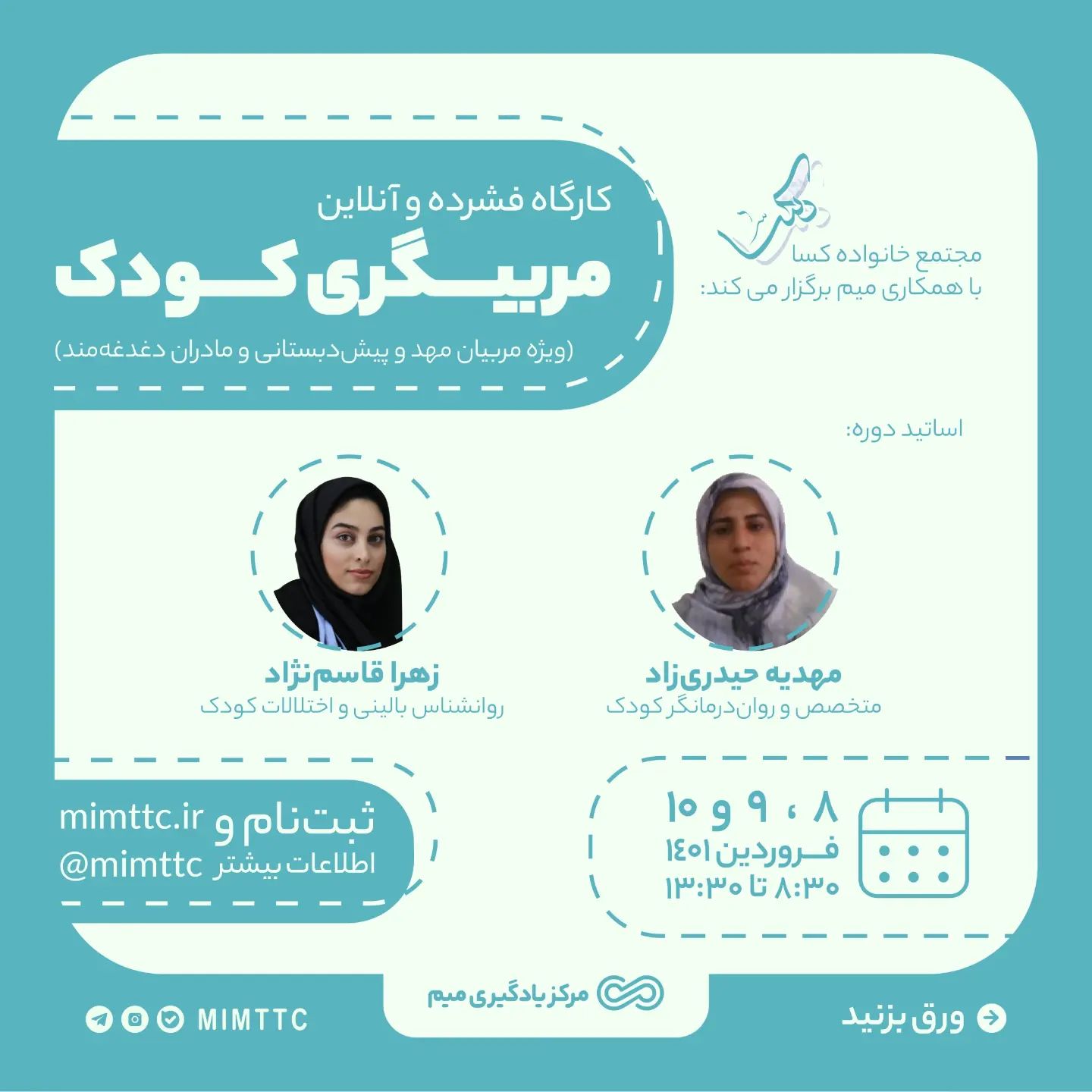 . شخصیت بچهها عمدتا در سنین پیش از دبستان شکل میگیره👧 بعد از مادر، یکی از افراد مهمی که در این دوره سنی با کودک در ارتباطه و تاثیر مهم روی کودک میگذاره، مربی مهدکودک هست.👩🏫 ✅ ما در کارگاه فشرده مربیگری کودک قراره به بررسی: 🔹رشد کودکان در ابعاد مختلف 🔹نیازها و چالشهای کودکان 🔹تحولات کودکان در نظریات و رویکردهای مختلف 🔹جایگاه و نقش مربی در برآورده کردن نیازهای کودکان و رشد آنان 🔹آموزش طرحدرس نویسی و بازیدرمانی برای کودکان بپردازیم. 📅زمان: 8 و 9 و 10 فروردین خوشحال میشیم در مسیر رشدی دیگر همراه شما باشیم🌹 📌لینک ثبتنام: 🌐 http://mimttc.ir/?p=3244
