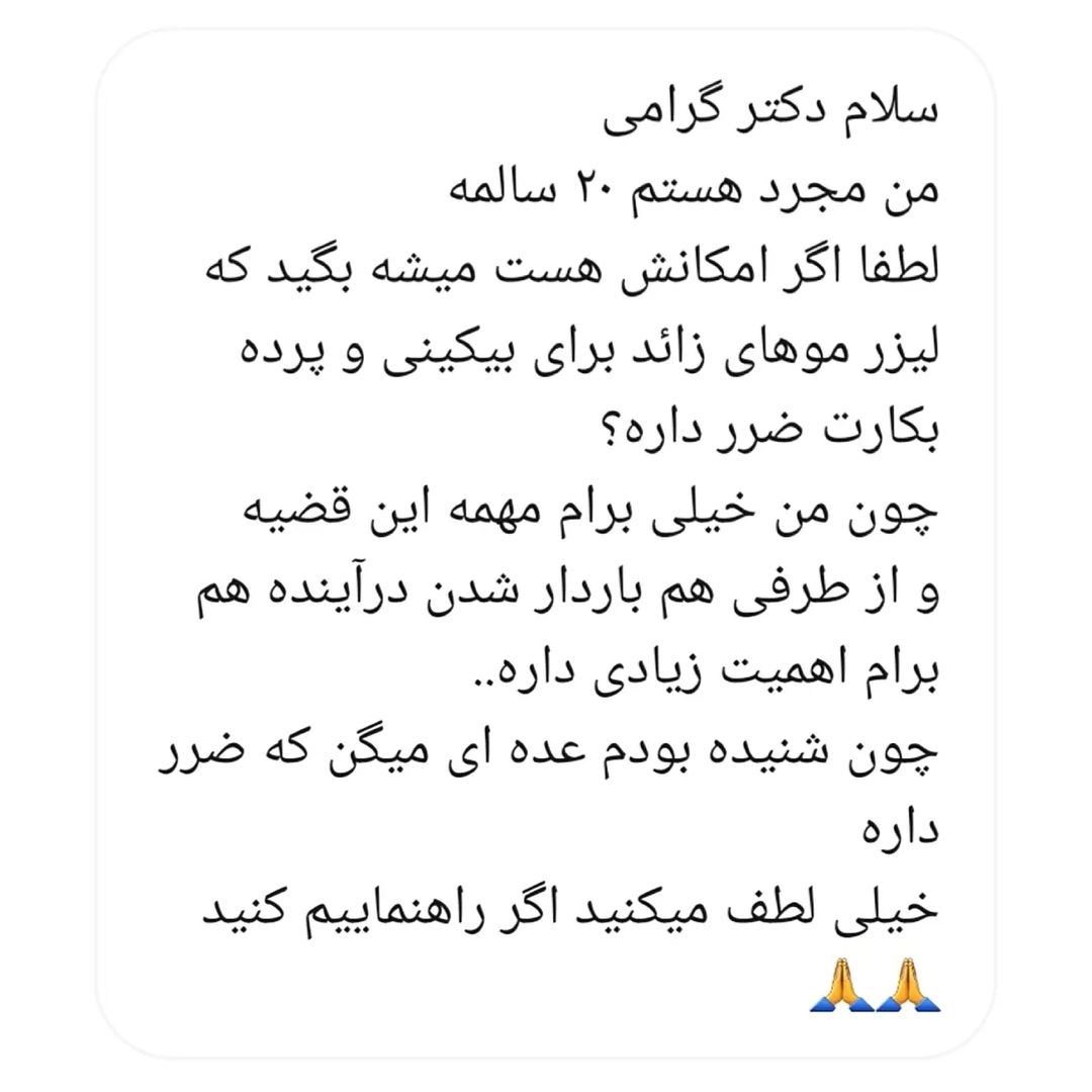 آیا لیزر بیکینی برای دختران عوارض داره؟؟؟ ◀️ سوال خیلی از خانمها و دختران جوان اینه که لیزر موهای بیکینی عوارض ناباروری ممکن ایجاد کنه ؟یا نه ؟ 📌و جواب خیر 🔶️فرایند لیزر چگونه هست ؟؟. پرتوهای لیزر به بخشی از پوست که قرار است درمان شود می تابند و به رنگ دانه های ملانینی مو گرما می دهند و به این ترتیب فولیکول های آن قسمت را از بین می برند. لیزر بدون این که هیچ آسیبی به بافت اطراف وارد کند فولیکول مو را از بین می برد. در هر کدام از فولیکول هایی که آسیب دیده باشند در آن ناحیه موی دیگری رشد نمی کند و موهایی که در داخل آن وجود داشتند نیز از بین می روند. 🔷️نکته مهم 👇 نوع لیزری که برای از بین بردن موهای زائد استفاده می شود کمتر از یک میلی متر به پوست نفوذ می کند. پس به هیچ کدام از اندام های داخلی بدن مثل تخمدان ها برخورد نمی کند و در نتیجه به آن ها آسیب نمی رساند . پس مشکل ناباروری ایجاد نمیکند. 📌و توصیه مهم برای انجام لیزر یک مرکز معتبر و انتخاب کنید و مراقبت های قبل لیزر و بعد لیزر و انجام بدید تا عوارض سوختگی ملایم پوست و قرمزی و خارش به حداقل برسه خیلی از مراکز بدون رعایت اصول بهداشتی و بدون کادر مجرب اقدام به لیزر میکنن که ممکن آسیب پوستی و مشکلات پوستی برای فرد مراجعه کننده ایجاد شود . . 📌اگر در آین مورد سوالی دارید کامنت بزارید. . . مشاوره_زنان_بارداری_زایمان تعیین جنسیت جنین 👶 ویزیت آنلاین/حضوری/تلفنی @moshaver.mama . . . #لیزر_مو_زائد #لیزر_بیکینی #لیزر #دختران #ناباروری #ناباروری_زنان #مامایی #معاینه_زنان #ویزیت #بارداری