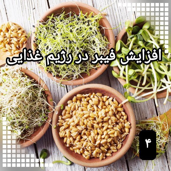 - میوههایی مثل هلو، گوجهفرنگی، خیار و سیب را پوست نگیرید. - از ماش جوانهزده يا جوانه گندم سالاد درست کنید. یا آنها را به ماست یا سالاد اضافه کنید. - بهجای چیپسهای چربیدار، ذرت بوداده مصرف کنید. - هنگام چرخ کردن گوشت برای تهیه شامی، کتلت یا کوفته قلقلی، مقدار یک فنجان جو یا گندم پرک شده به یک کیلو گوشت اضافه کنید. - در تنظیم برنامه غذایی، خوراکهایی را انتخاب کنید که از حبوبات بلغور و غلات تهیه میشوند. منبع: بهترین کلیدهای تغذیه برای کودک و نوجوان #افزایش_فیبر