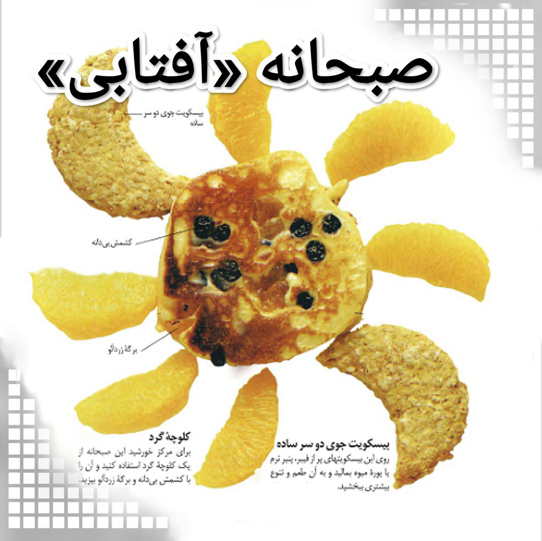 این صبحانهی پرانرژی با #غلات معمول تفاوت دارد و برای آماده شدن، زمان زیادی نمیبرد. افزودن #میوههای خشک شده به کلوچه نان، به آن #ویتامینها، #فیبر و #آهن بیشتری میافزاید. شما میتوانید این صبحانه را با بیسکویت، جوی دوسر، و چند پر پرتقال که آبدار است و سرشار از ویتامین ث سرو کنید. پوست و دانههای پرتقال را جدا کنید تا در گلوی کودک گیر نکند. پرهای پرتقال را به ترتیبی قرار دهید که شبیه اشعههای خورشید به نظر برسند. "طرز تهیه کلوچه گرد":https://www.bamano.life/post/35253 و "طرز تهیه بیسکویت جوی دوسر":https://www.bamano.life/post/35254 را ببینید. منبع: اولین غذاها #صبحانه #تزیین_غذا