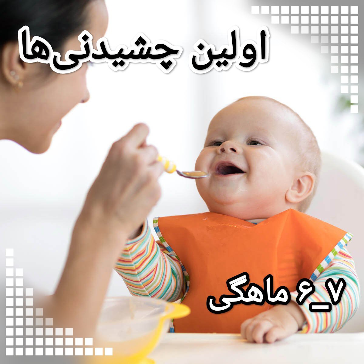 ۶-۷ ماهگی: غلات: غلات گندمی، پودر هفت مغز، محصولات گندم، نان، نان برشته، بیسکویت برشته ساده کودک انواع نوشیدنیها: شیر گاو با چربی کامل سبزیجات: گوجه فرنگی(در ابتدا بی پوست)، سیب زمینی، به علاوه سایر سبزیجات قبلی میوهها: زردآلوی خشک خیسانده و سایر میوه های خشک( اما هنوز باید از کشمش و کشمش بیدانه اجتناب شود.) محصولات لبنی: شیر گاو با چربی کامل، پنیرهای نرم و سخت، ماست ساده یا همراه با پوره میوهها گوشت: گوشت سفید، جوجه، بوقلمون، جگر، گوشت بره، گوشت گوساله حبوبات: تافو، عدس، نخود ماهی: ماهی سفید، بیپوست و استخوان تخم مرغ: فقط زرده تخم مرغ دانه ها، مغزها: هنوز زود است. این غذاهارا محدود کنید: انواع نوشیدنیهای شیرین از جمله شربتهای نوشیدنی مانند آب انگور سیاه «غذاها به صورت ریزشده، خوردشده و لهشده باشد.» منبع: اولین غذاها #غذای_کمکی