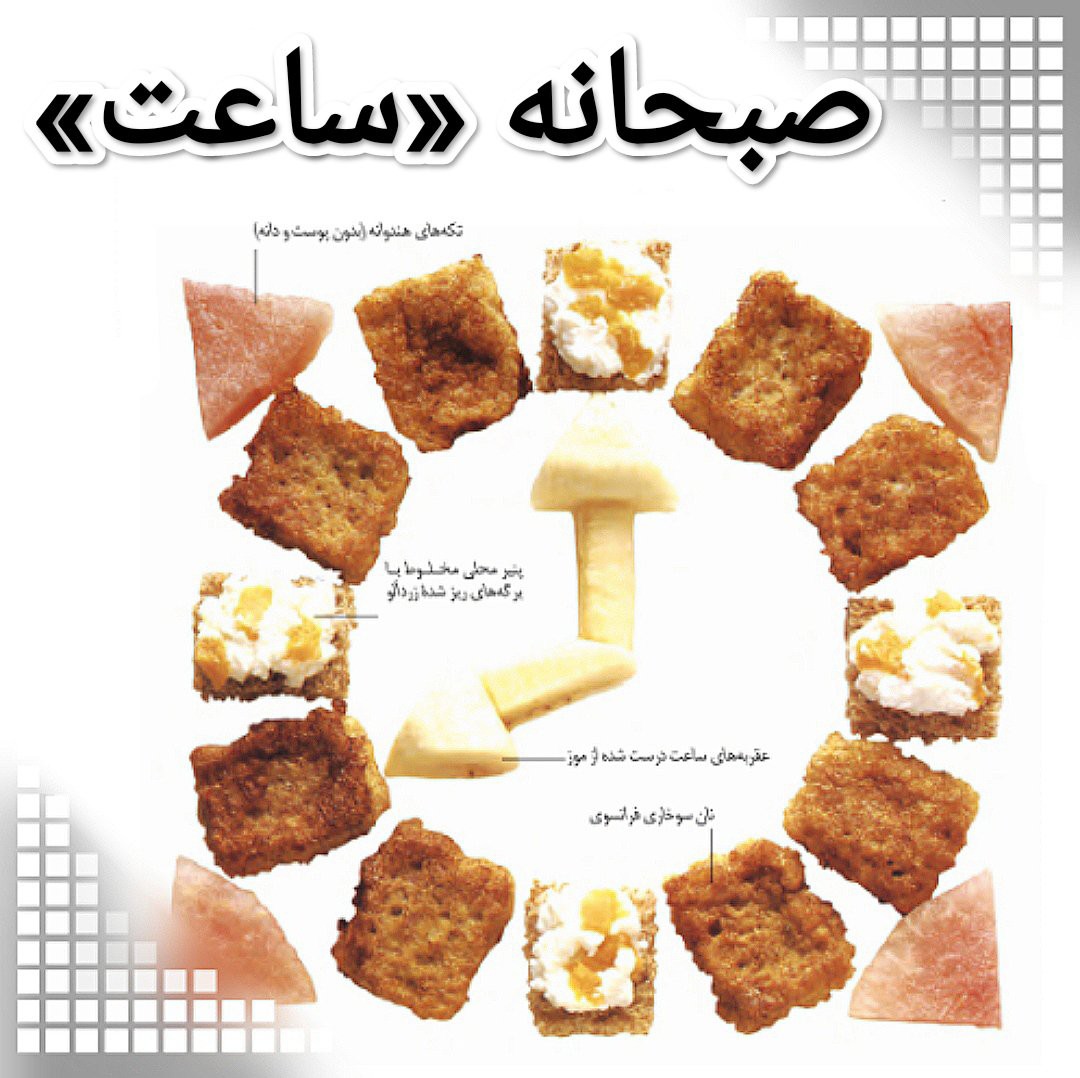 نان، تخم مرغ، پنیر نرم و میوه را با هم ترکیب کنید و این صبحانه را که به شکل ساعت است آماده کنید. کودکان بزرگتر هنگام خوردن این صبحانه سعی میکنند بگویند که #ساعت چند است و از خوردن آن به شکلی که خودشان دوست دارند لذت خواهند برد. تکههای نان را در تخممرغ زده شده فروبرده و به آنها به اندازه یک قاشق غذاخوری شیر اضافه کنید. پس از آنکه نان به طور کامل در مخلوط یکدست تخممرغ پوشیده شد، آن را در یک ماهیتابه نچسب که سطح آن با کمی روغن چرب شده، به سرعت تفت دهید. برای تهیه یک غذای سریعتر ميتوانید تکههای نان گندم سبوسدار را با یک مربای میوهای، پوره میوه مانند پوره آلو، یا پنیر نرم و میوه ی ریز شده مخلوط کنید. #میوه یک غذای آماده خوب است -حتی برای صبحانه- و بهتر است هر روز از چند قاشق میوه تازه، به عنوان غذای #میانوعده و یا همراه با غذاهای اصلی استفاده کنید. هشت تکه نان را در تخممرغ و شیر فرو برده و تفت دهید. روی چهار تکه نان دیگر پنیر محلی بمالید و برگههای ریز شده زردآلو بگذارید آنها را مانند صفحه یک ساعت مرتب کنید و به جای عقربههایش از موز استفاده کنید. منبع: اولین غذاها #صبحانه #تزیین_غذا