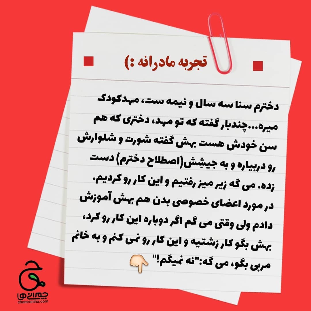 . به خاطر این قضیه خیلی ناراحت و کلافه بودم، نمیدونستم چیکار کنم؟😔 . برای همین به یه مشاور مراجعه کردم و با توصیه هاش این مسئله به مرور حل شد! 👇🏻😊 . اول ازهمه بهم کمک کرد نسبت به این مسئله خونسردباشم و بفهمم کنجکاوی جنسی گاهی تو این سن ایجاد میشه و مهم عکس العمل مادر و پدره که این مسئله رو تشدید کنه یا نه! . بعد با مربی دخترم صحبت کردم که حتما به خانواده ی اون دختر بچه اطلاع بدن و به مشاور مراجعه کنن چون احتمال دادیم بهش آموزش داده شده باشه و برای همین هم به شدت حساس بوده و یا از بس خانواده با پوشوندن عضو خصوصیش حساسیت نشون داده بودن که کنجکاو شده. . بعد پرس و جو فهمیدم بی انگیزگی بچه باعث شده بوده به فعالیت های دیگه علاقه نشون نده و درگیر کنجکاوی و پیشنهاد به بچه های دیگه بشه. . اما ... درباره ی سنای خودم! فهمیدم دخترم دچار ضعف شخصیتی شده، برای همین هم نمیتونه به اون بچه نه بگه و ازش تبعیت میکنه...🥺 . مشاور راست گفت... من خیلی بهش امرو نهی میکردم، مدام ازش حمایت میکردم و به خودم وابسته ش کرده بودم، اجازه نمیدادم دخترم مستقل بار بیاد...😥 . بعد اون ماجرا،از مربی خواستم تا جایی که ممکنه این دوتا بچه باهم تنها نشن، تا میتونه اونها رو درگیر بازی و فعالیت کنه که بیکار نشن و حواسش باشه و اگر دید اونکار تکرار شد، واکنش شدید نشون نده و اون هارو مشغول کار دیگه ای کنه. . ما هم تو خونه، بازی های هیجانی مثل آب بازی، دویدن در فضای باز، پریدن از ارتفاع، شنا و ... بیشتر کردیم و نذاشتیم سنا بیکار باشه. با اینکه خیلییی سخت بود اما من و پدرش امر و نهی ها و حساسیت هامون رو کمتر کردیم. بهش اجازه دادیم تو فعالیت های شخصی مانند غذا خوردن، دستشویی رفتن، لباس پوشیدن و حتی ارتباط با دیگران، استقلال بیشتری داشته باشه... . یکم زمان بر بود اما خداروشکر الان خیالم راحته و اون مسئله هم حل شده😊 . ⭕شما چنین تجربه هایی داشتین؟؟؟🤔 برامون کامنت کنید👇🏻 . #تجربه_مادر #تجربه_مادرانه#بازی_هیجانی #تربیت_جنسی #کنجکاوی_جنسی_کودکان #کارگاه_تربیت_جنسی_کودک #تربیت_جنسی_کودک