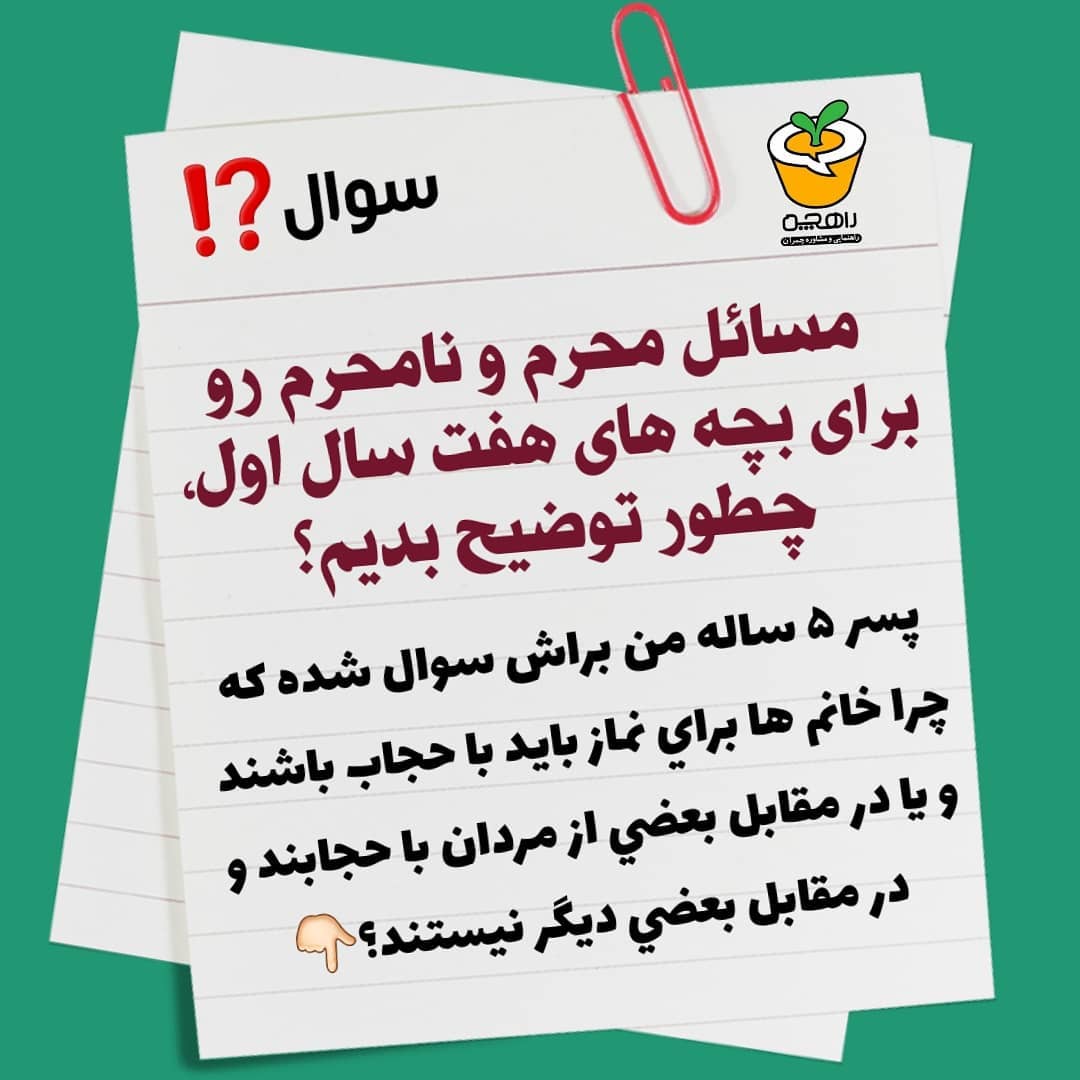 . مسئله ی محرم، نامحرم رو چه جوری براش بگم؟؟🤔 . ✅ توصیف مساله: بچه ها در چه سنی حریم ها را درک می کنند؟ ▫️ریشهها: بچه های زیر 7سال به خاطر عدم توان درک انتزاعی، احکام و حریم های اعتباری را نمی توانند درک کنند. برادر تو محرمه و پسر عموی تو محرم نیست. این یک اعتبار است که واقعیت خارجی ندارد. یعنی در خارج پسر عمو خاصیت ملموسی ندارد که بچه دقیقا فهم کند که برای چه او محرم نیست. جواب به اینگونه سوالات خیلی ساده و ملموس و کودکانه باید باشد. مثلا اینکه باباها بعضی جاها با کت و شلوار می روند، مامان ها هم با چادر. باباها موقع فوتبال لباس ورزشی می پوشند، موقع کار هم لباس کار. مامان ها هم همینطور. توضیح حکم شرعی و حواشی آن خیلی پیچیده است و بچه ها را دچار حساسیت هایی مافوق سن شان می کند. ⭕راهکارها: در مورد محرم و نامحرم برای هفت سال اول، نباید حساسیت ایجاد کرد و نیازی به توضیح آن نیست. تنها نکته ای که در مورد بچه ها مهم است نوع همبازی آن هاست که بهتر است بیشتر همبازی هم جنس باشد و با فاصله ی سنی مناسب. اما این اولویت هم بیشتر بحث تربیتی است و ارتباطی با محرم و نامحرم بودن ندارد. این نکته به شکل گیری شخصیت مردانه در پسرها و زنانه در دخترها کمک می کند. . 🔷️این پست رو سیو کنید و برای مادر و پدرها بفرستید، شاید دغدغه شون باشه🤗 . ⁉️شما باشین چه پاسخی به این مادر میدید؟ برامون کامنت کنید👇🏻 . #پرسش_و_پاسخ #سوال_تربیتی #سوال_مذهبی#ماه_رمضان #محرم_نامحرم #والدگری #والدین_آگاه #تربیت_دینی