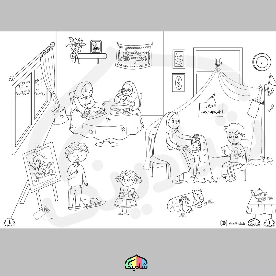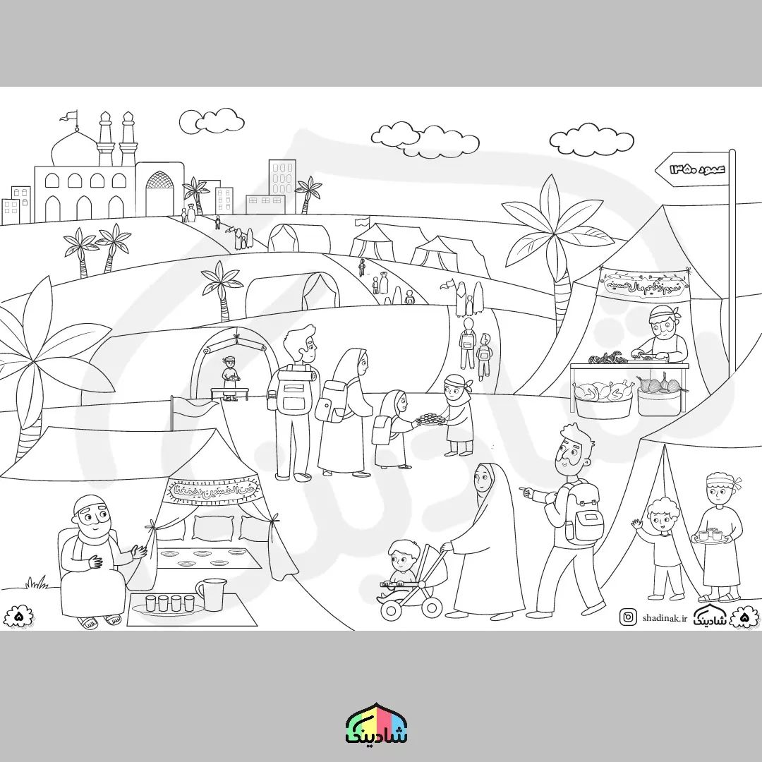 و این هم نمای پنجم وآخر با موضوع پیاده روی اربعین خیلی فکر کردیم نمای قبلی رو چه جوری با این ارتباط بدیم ... تصویرگر مون زحمت کشیدند و اون ایده چادر تعزیه و موکب رو اتود زدند و انصافا عالی شد ... #اربعین #موکب #عزیزم_حسین #کودکانه #کودک_مسلمان #بچه_شیعه #محرم #روضه_خانگی #هیئت