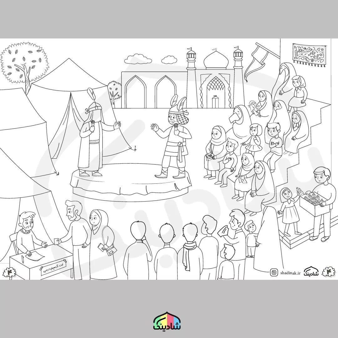 نمای چهارم اولین و بزرگترین #رنگ_آمیزی متری با موضوع #عزاداری یادش به خیر قدیما چه قد تعزیه خوانی بیشتر بود ، البته همه ی صحنه هاش مناسب کودکان نیست ولی کلا به یادموندنیه.. گوشه ی سمت چپ حیاط مسجد دارن ثبت نام میکنند برای پیاده روی اربعین مطمئن باشید برای سرگرم کردن بچه ها خیلی مفیده توی عزاداری ها و #روضه های خانگی.. ... #روضه #رول_کاغذ #رنگ_آمیزی