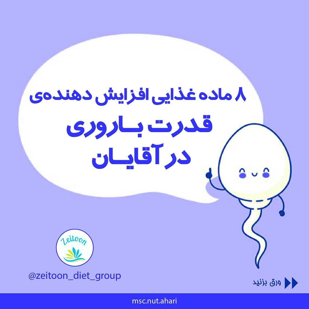 💎💎💎💎💎💎 با این غذاها میشه قدرت باروری آقایان را افزایش داد پنجاه درصد شانس بارداری به قدرت باروری آقا مربوط است 🌹🌹🌹 آقایانی که از لحاظ تعداد اسپرم پایین هستند آقایانی که تحرک اسپرم اونها کم هست و شکل و مورفولوژی اسپرمشون مناسب نیست، قدرت باروری پایینی داشته یا اصلا قدرت باروری ندارند ۸ ماده غذایی که نام اونها ذکر شده باعث افزایش قدرت باروری آقایون میشن شکلات تلخ بدلیل داشتن روی فراوان، آب انار بدلیل آنتی اکسیدانهای موجود در اون، پرتقال و سایر مرکبات به دلیل ویتامین ث بالا ، آجیل بعلت سلنیوم فراوان، سبزیجات سبز برگ بعلت اسید فولیک و سالمون و ساردین بدلیل دلشتن امگا ۳ باعث افزایش تعداد و تخرک اسپرمها میشن پس بهتره که اغلب در برنامه غذایی زوج هایی که منتظر بچه دار شدن هستند گنجانده بشه👌👌👌👌 جهت اخذ رژیم های امادگی برای بارداری، افزایش قدرت باروری و رژیم های بارداری دایرکت بدید ✔🙏✔ پیج دوم ما @minoo_mom_diet #تغذیه_بارداری_گروه_مادران #تغذیه_تعیین_جنسیت #رژیم_باردارے #رژیم_بارداری_شیردهی #تغذیه_باروری_مردان #تغذیه_باروری_زنان #متخصص_تغذیه_خوب #متخصص_تغذیه_بارداری #تغذیه_بارداری_اهری #رژیم_بارداری_اهری #pregnancy_diet #pregnancy_dietitioan #pregnancy_diet_plan #طعام_الحمل #طعام_الرضيع ##باما_نوروز